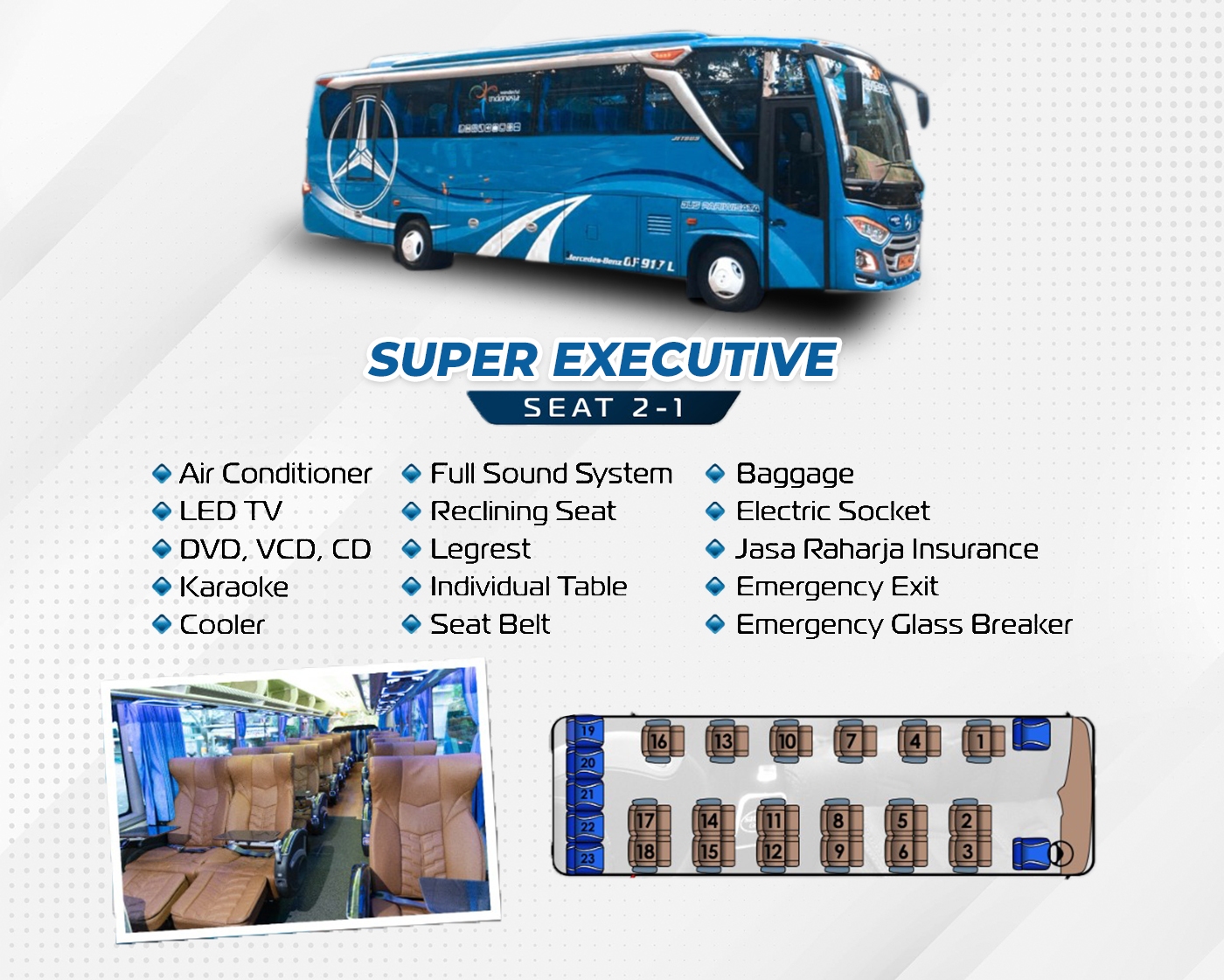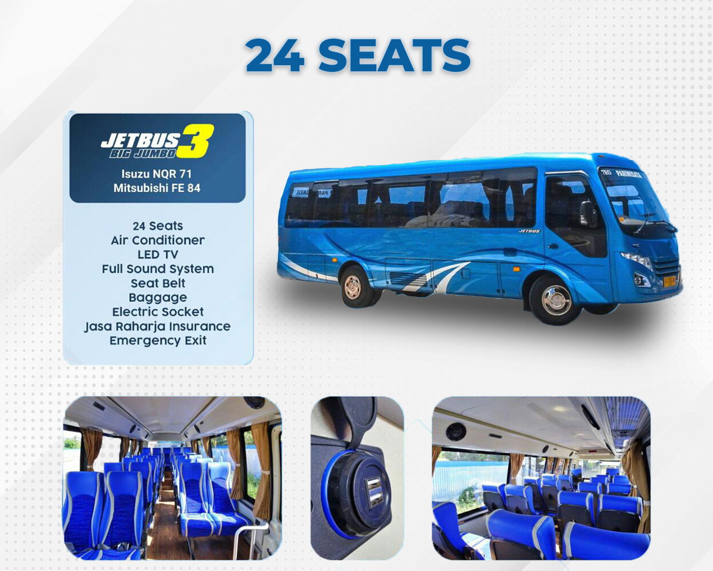 • Bus dilengkapi fasilitas AC, Reclining Seat, TV, Audio System, Mike, Cooler, Safety Belt,