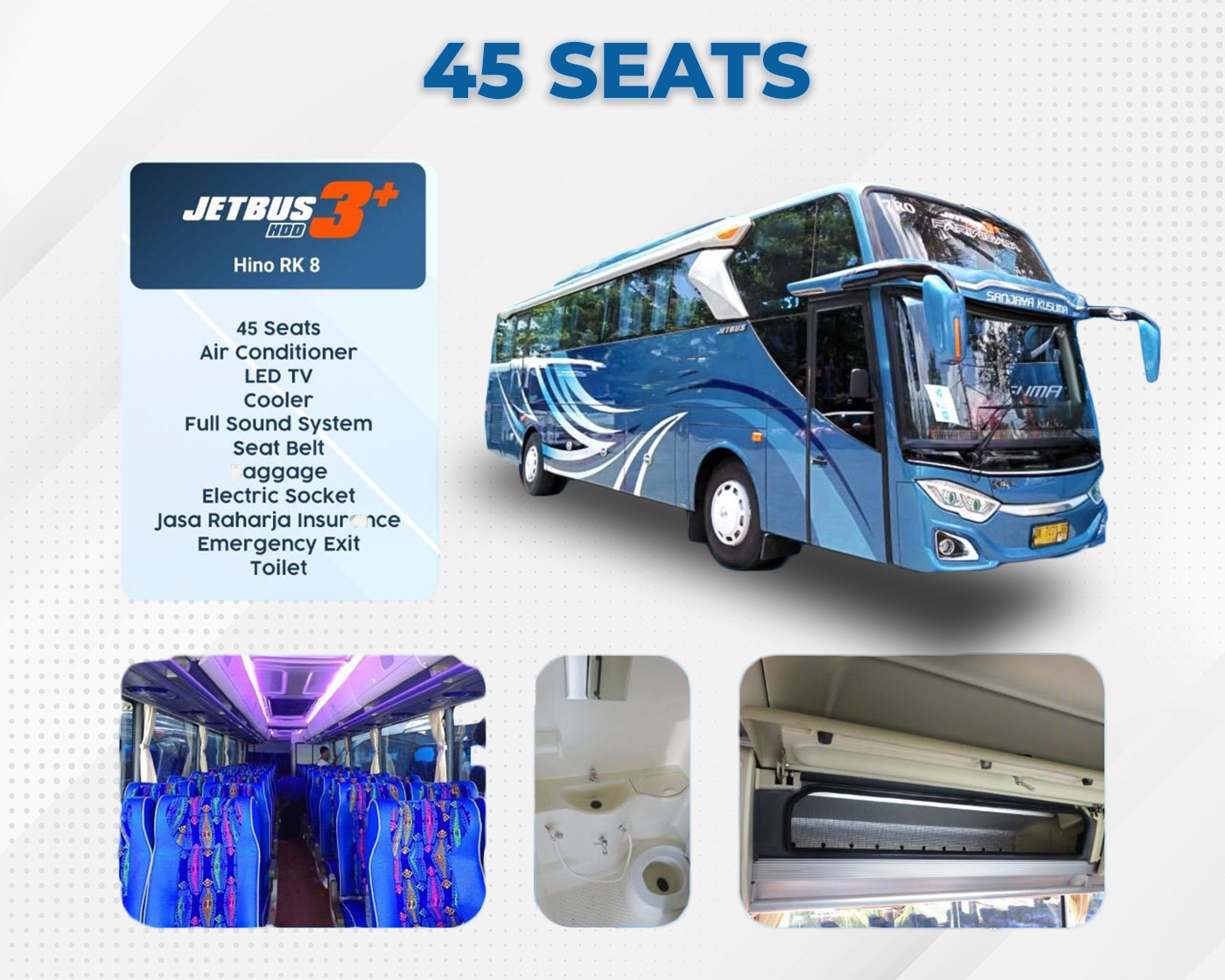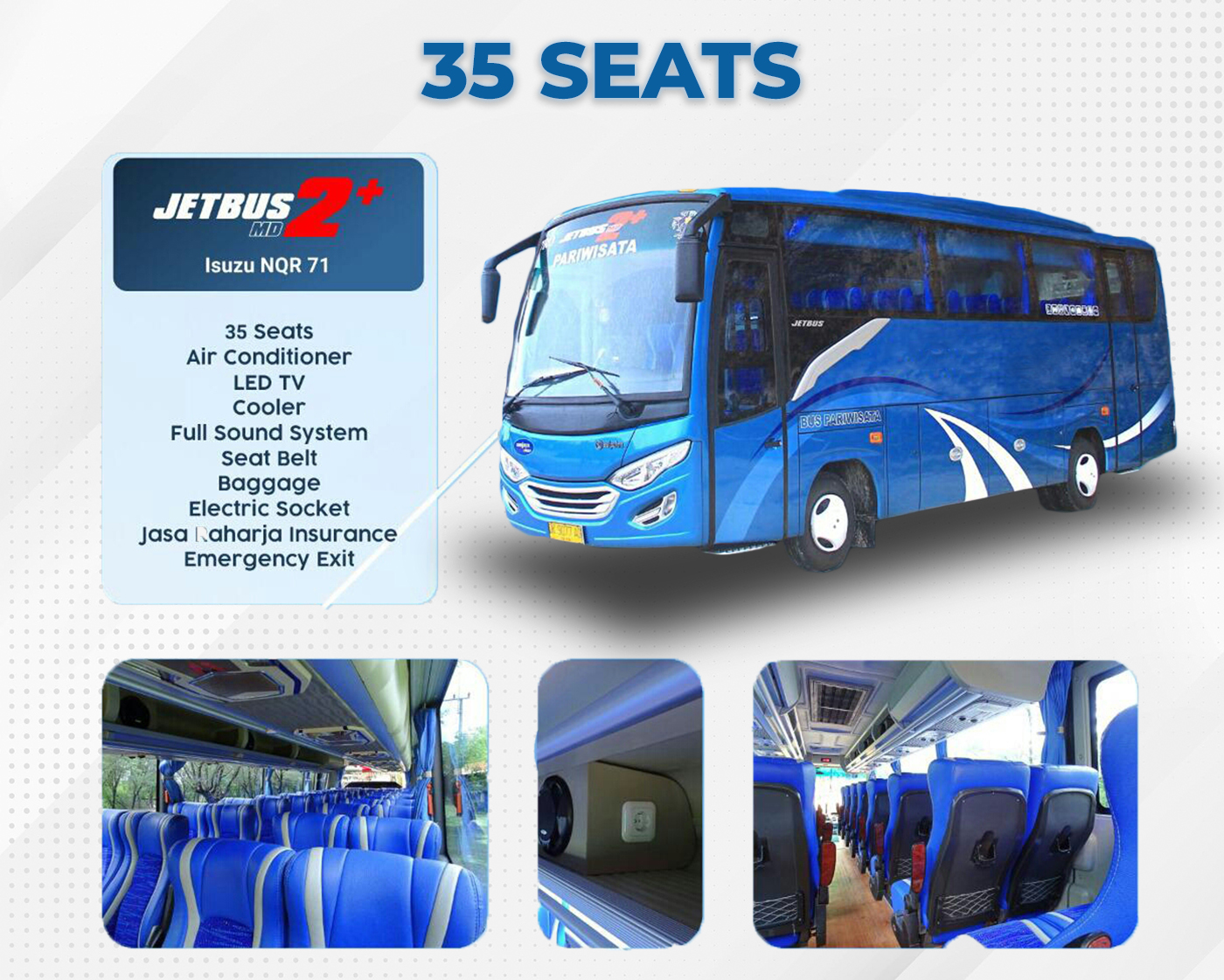 Tersedia bus 25, 30, 35 & 45 seat sesuai kebutuhan rombongan Anda